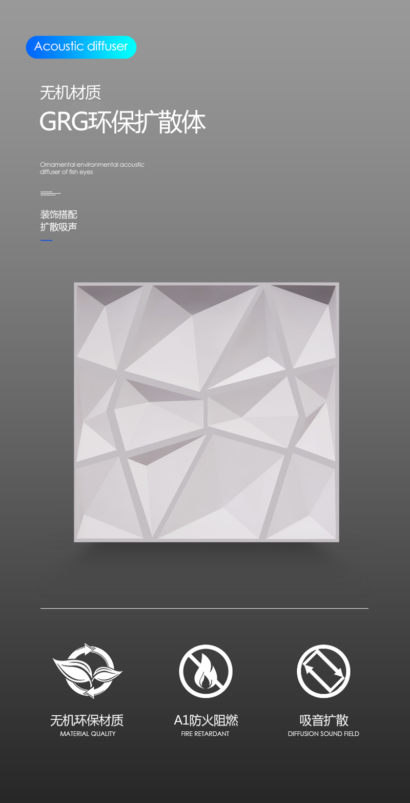 8、聲學(xué)效果好:檢測表明:4mm厚的G.R.G.材料,透過損失500Hz23dB、100Hz27dB;氣干比重1.88符合專業(yè)聲學(xué)反射要求。經(jīng)過良好的造型設(shè)計(jì),可構(gòu)成良好的吸聲結(jié)構(gòu),達(dá)到隔聲、吸音的作用。 間僅需30分鐘,干燥時間僅需4個小時。因此能大大縮短施工周期。